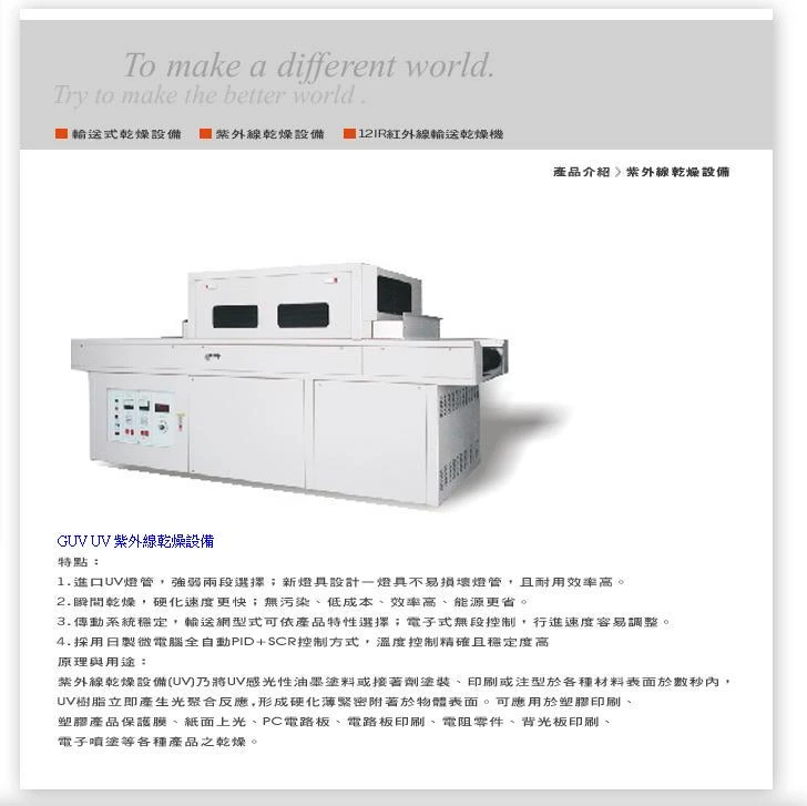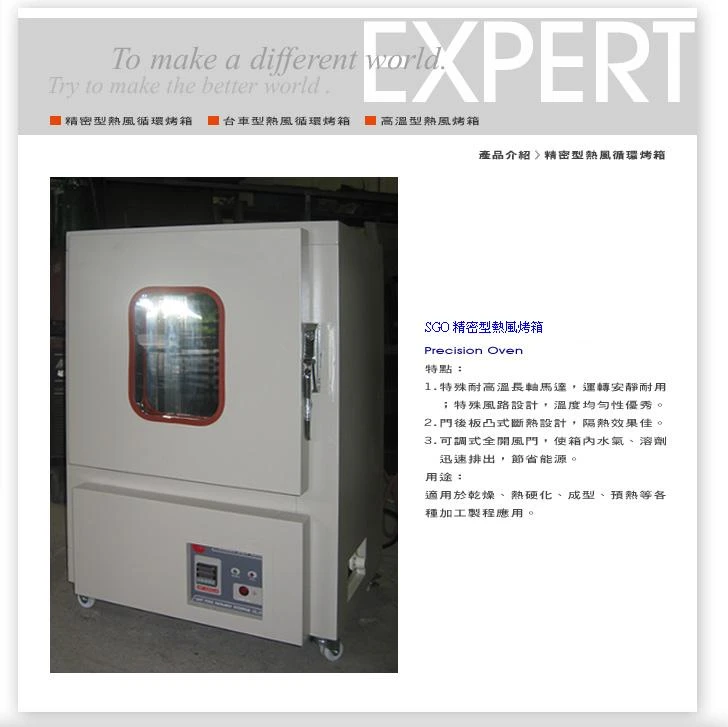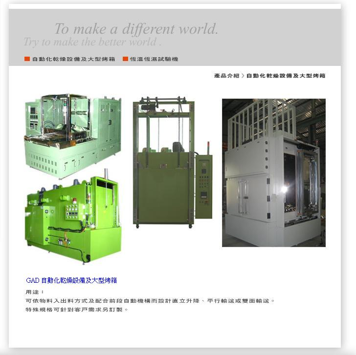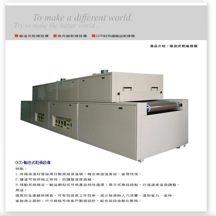 公司是製造精密熱烘烤箱 無塵乾燥設備 高溫乾燥設備 無氧化烤箱 IR&UV乾燥設備 自動化乾燥設備 輸送帶乾燥設備~用於行業:化工、塑膠、食品、培茶、電子、電機、電鍍、製藥等工業用烘拷、乾燥、熱化、回火、預熱、試驗.....